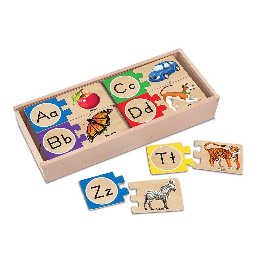 - EDUCATIONAL ALPHABET LETTER PUZZLE: The Melissa & Doug Self-Correcting Alphabet Letter Puzzle set includes 52 durable wooden pieces that help kids learn the ABCs as they match letters to pictures.
