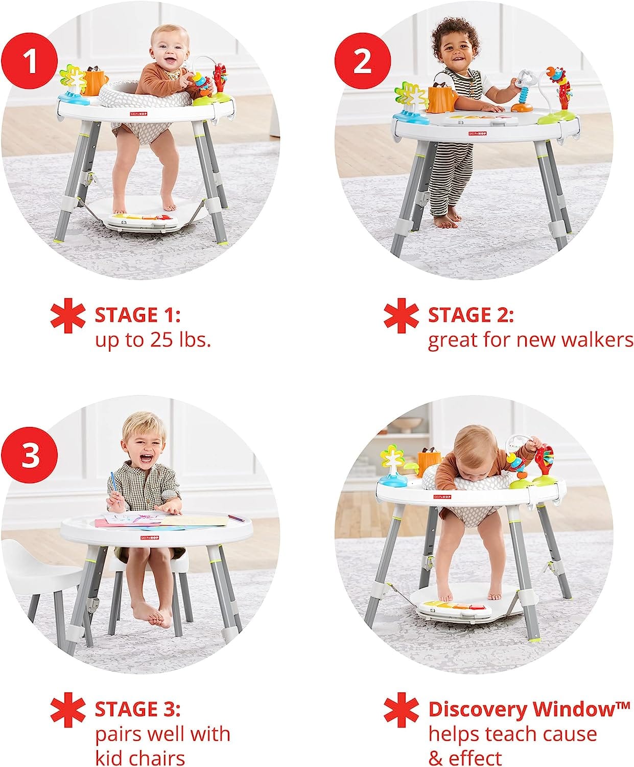- Three stages of use: Sit, swivel, bounce & play; Cruise & interact; Play table; 25+ developmental activities